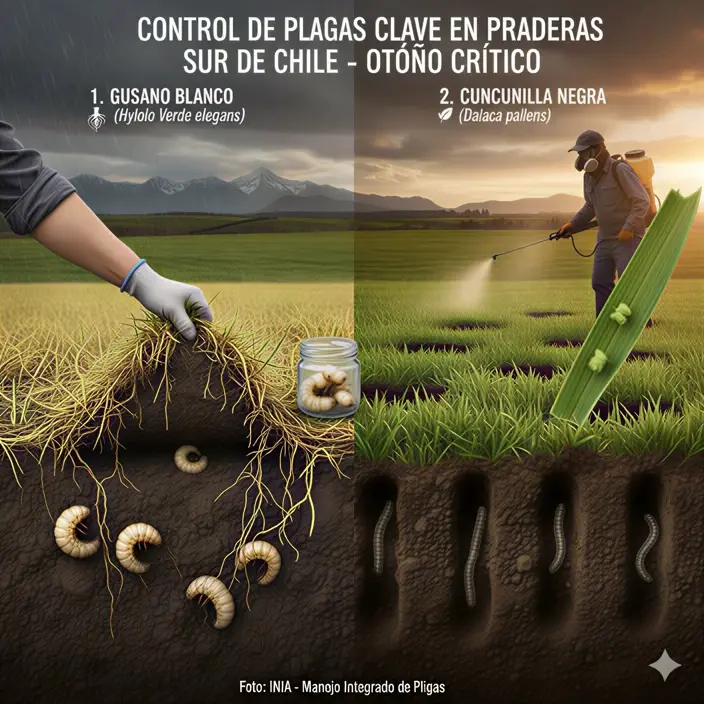Una de las claves del éxito de la productividad y persistencia de una pradera es hacer un correcto monitoreo e identificación de plagas. Es por esto que hay que tener especial cuidado en las épocas en las que la pradera podría correr más riesgos; en nuestro caso, corresponde a los meses de otoño. Realizar muestreos y estar pendiente de los tipos de daño existentes le pueden permitir actuar a tiempo para el control de los enemigos de nuestros sistemas. Con la información presentada en este artículo, se busca entregar herramientas que le permitan, en terreno, evaluar su situación, realizar un buen diagnóstico y elegir el momento correcto de control.