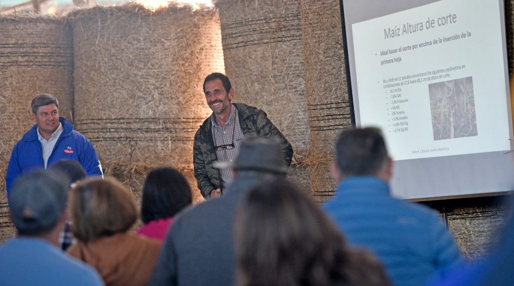 En la ocasión contamos con 2 expositores; Andrés Hinostroza Ing. Agrónomo de Colun y Pablo Cattani, Ing. Agrónomo asesor internacional en calidad de forrajes conservados. En charlas que se fueron entrelazando para dar mayor continuidad y sentido, al desarrollo del tema en cuestión, se presentaron los “Análisis de Resultados de los Ensilajes de Maíz en los Últimos 5 Años”, donde Andrés Hinostroza fue analizando los rendimientos, los aportes nutricionales de un buen ensilaje de maíz comparados con los resultados reales de las muestras analizadas en laboratorio y se capacitó a los asistentes en la correcta interpretación de los resultados obtenidos en las muestras del laboratorio. Pablo Cattani por su parte, se refirió a “Buenas Prácticas para la Cosecha y Conservación de Ensilajes de Maíz”, en dónde describió los aspectos prácticos para tomar una buena decisión al momento de la cosecha del cultivo, tamaño de picado óptimo y crackeado del grano, dimensión de las parvas, confección y correcta forma de compactación del material a ensilar.