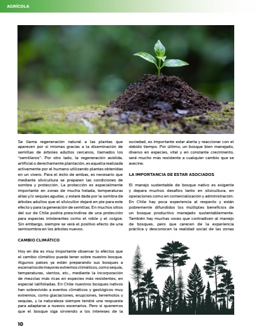 10AGRÍCOLASe llama regeneración natural a las plantas que aparecen por si mismas gracias a la diseminación de semillas de árboles adultos cercanos, llamados los “semilleros”. Por otro lado, la regeneración asistida, artificial o derechamente plantación, es aquella realizada activamente por el humano utilizando plantas obtenidas en un vivero. Para el éxito de ambas, es necesario que mediante silvicultura se preparen las condiciones de sombra y protección. La protección es especialmente importante en zonas de mucha helada, temperaturas altas y/o sequías agudas, y estará dada por la sombra de árboles adultos que el silvicultor dejará en pie para este efecto y para la generación de semillas. En muchos sitios del sur de Chile podría prescindirse de una protección para especies intolerantes como el roble y el coigüe. Sin embargo, siempre se verá el positivo efecto de una semisombra en los árboles nuevos.CAMBIO CLIMÁTICO Hoy en día es muy importante observar lo efectos que el cambio climático pueda tener sobre nuestro bosque. Algunos países ya están preparando sus bosques a escenarios de mayores extremos climáticos, como sequía, temperaturas, vientos, etc., mediante la incorporación de mezclas más ricas en especies más resistentes, en especial latifoliadas. En Chile nuestros bosques nativos han sobrevivido a eventos climáticos y geológicos muy extremos, como glaciaciones, erupciones, terremotos y sequias, y la naturaleza siempre tendrá una respuesta para adaptarse a nuevos escenarios. Pero si queremos que el bosque siga sirviendo a los intereses de la sociedad, es importante estar alerta y reaccionar con el debido tiempo. Por último, un bosque bien manejado, diverso en especies, vital y en constante crecimiento, será mucho más resistente a cualquier cambio que se avecine.LA IMPORTANCIA DE ESTAR ASOCIADOS El manejo sustentable de bosque nativo es exigente y depara muchos desafíos tanto en silvicultura, en operaciones como en comercialización y administración. En Chile hay poca experiencia al respecto y están pobremente difundidos los múltiples beneficios de un bosque productivo manejado sustentablemente. También hay muchas voces que contradicen al manejo de bosques, pero que carecen de la experiencia práctica y desconocen la realidad social de las zonas