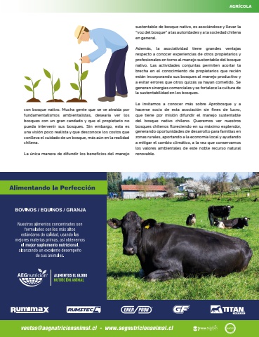 11AGRÍCOLAcon bosque nativo. Mucha gente que se ve atraída por fundamentalismos ambientalistas, desearía ver los bosques con un gran candado y que el propietario no pueda intervenir sus bosques. Sin embargo, esta es una visión poco realista y que desconoce los costos que conlleva el cuidado de un bosque, más aún en la realidad chilena. La única manera de difundir los beneficios del manejo sustentable de bosque nativo, es asociándose y llevar la “voz del bosque” a las autoridades y a la sociedad chilena en general. Además, la asociatividad tiene grandes ventajas respecto a conocer experiencias de otros propietarios y profesionales en torno al manejo sustentable del bosque nativo. Las actividades conjuntas permiten acortar la brecha en el conocimiento de propietarios que recién están incorporando sus bosques al manejo productivo y a evitar errores que otros quizás ya hayan cometido. Se generan sinergias comerciales y se fortalece la cultura de la sustentabilidad en los bosques. Le invitamos a conocer más sobre Aprobosque y a hacerse socio de esta asociación sin fines de lucro, que tiene por misión difundir el manejo sustentable del bosque nativo chileno. Queremos ver nuestros bosques chilenos floreciendo en su máximo esplendor, generando oportunidades de desarrollo para familias en zonas rurales, aportando a la economía local y ayudando a mitigar el cambio climático, a la vez que conservamos los valores ambientales de este noble recurso natural renovable.