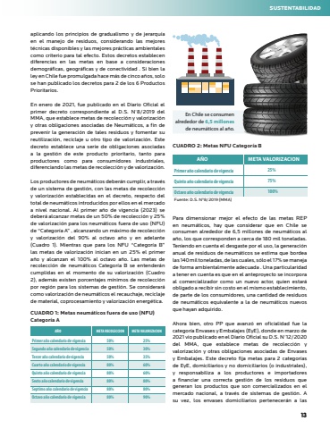 13SUSTENTABILIDADaplicando los principios de gradualismo y de jerarquía en el manejo de residuos, considerando las mejores técnicas disponibles y las mejores prácticas ambientales como criterio para tal efecto. Estos decretos establecen diferencias en las metas en base a consideraciones demográficas, geográficas y de conectividad . Si bien la ley en Chile fue promulgada hace más de cinco años, solo se han publicado los decretos para 2 de los 6 Productos Prioritarios. En enero de 2021, fue publicado en el Diario Oficial el primer decreto correspondiente al D.S. N°8/2019 del MMA, que establece metas de recolección y valorización y otras obligaciones asociadas de Neumáticos, a fin de prevenir la generación de tales residuos y fomentar su reutilización, reciclaje u otro tipo de valorización. Este decreto establece una serie de obligaciones asociadas a la gestión de este producto prioritario, tanto para productores como para consumidores industriales, diferenciando las metas de recolección y de valorización. Los productores de neumáticos deberán cumplir, a través de un sistema de gestión, con las metas de recolección y valorización establecidas en el decreto, respecto del total de neumáticos introducidos por ellos en el mercado a nivel nacional. Al primer año de vigencia (2023) se deberá alcanzar metas de un 50% de recolección y 25% de valorización para los neumáticos fuera de uso (NFU) de “Categoría A” , alcanzando un máximo de recolección y valorización del 90% al octavo año y en adelante (Cuadro 1). Mientras que para los NFU “Categoría B” las metas de valorización inician en un 25% el primer año y alcanzan el 100% al octavo año. Las metas de recolección de neumáticos Categoría B se entenderán cumplidas en el momento de su valorización (Cuadro 2), además existen porcentajes mínimos de recolección por región para los sistemas de gestión. Se considerará como valorización de neumáticos el recauchaje, reciclaje de material, coprocesamiento y valorización energética.Para dimensionar mejor el efecto de las metas REP en neumáticos, hay que considerar que en Chile se consumen alrededor de 6,5 millones de neumáticos al año, los que corresponden a cerca de 180 mil toneladas. Teniendo en cuenta el desgaste por el uso, la generación anual de residuos de neumáticos se estima que bordea las 140 mil toneladas, de las cuales, sólo el 17% se maneja de forma ambientalmente adecuada . Una particularidad a tener en cuenta es que en el anteproyecto se incorpora al comercializador como un nuevo actor, quien estará obligado a recibir sin costo en el mismo establecimiento, de parte de los consumidores, una cantidad de residuos de neumáticos equivalente a la de neumáticos nuevos que hayan adquirido. Ahora bien, otro PP que avanzó en oficialidad fue la categoría Envases y Embalajes (EyE), donde en marzo de 2021 vio publicado en el Diario Oficial su D.S. N°12/2020 del MMA, que establece metas de recolección y valorización y otras obligaciones asociadas de Envases y Embalajes. Este decreto fija metas para 2 categorías de EyE, domiciliarios y no domiciliarios (o industriales), y responsabiliza a los productores e importadores a financiar una correcta gestión de los residuos que generan los productos que son comercializados en el mercado nacional, a través de sistemas de gestión. A su vez, los envases domiciliarios pertenecerán a las CUADRO 1: Metas neumáticos fuera de uso (NFU)Categoría Afiffffl ffiflfiflfflflffl ffiflfififflfiffl ffl CUADRO 2: Metas NFU Categoría Bfifffflffiflffflfffflflfflflfflfflflfffflflfflflffl flfffflflfflflffl fiffffl ffiflfififflfifflfifffflffiflfflfflffffffl fflfffflfflFuente: D.S. Nº8/2019 (MMA)