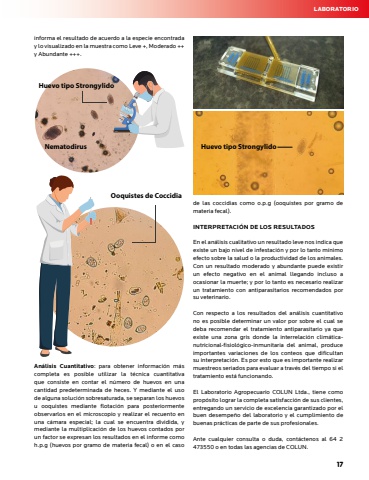 17LABORATORIOinforma el resultado de acuerdo a la especie encontrada y lo visualizado en la muestra como Leve +, Moderado ++ y Abundante +++. Análisis Cuantitativo: para obtener información más completa es posible utilizar la técnica cuantitativa que consiste en contar el número de huevos en una cantidad predeterminada de heces. Y mediante el uso de alguna solución sobresaturada, se separan los huevos u ooquistes mediante flotación para posteriormente observarlos en el microscopio y realizar el recuento en una cámara especial; la cual se encuentra dividida, y mediante la multiplicación de los huevos contados por un factor se expresan los resultados en el informe como h.p.g (huevos por gramo de materia fecal) o en el caso Ooquistes de CoccidiaHuevo tipo StrongylidoNematodirusde las coccidias como o.p.g (ooquistes por gramo de materia fecal). INTERPRETACIÓN DE LOS RESULTADOSEn el análisis cualitativo un resultado leve nos indica que existe un bajo nivel de infestación y por lo tanto mínimo efecto sobre la salud o la productividad de los animales. Con un resultado moderado y abundante puede existir un efecto negativo en el animal llegando incluso a ocasionar la muerte; y por lo tanto es necesario realizar un tratamiento con antiparasitarios recomendados por su veterinario. Con respecto a los resultados del análisis cuantitativo no es posible determinar un valor por sobre el cual se deba recomendar el tratamiento antiparasitario ya que existe una zona gris donde la interrelación climáticanutricional-fisiológico-inmunitaria del animal, produce importantes variaciones de los conteos que dificultan su interpretación. Es por esto que es importante realizar muestreos seriados para evaluar a través del tiempo si el tratamiento está funcionando.El Laboratorio Agropecuario COLUN Ltda., tiene como propósito lograr la completa satisfacción de sus clientes, entregando un servicio de excelencia garantizado por el buen desempeño del laboratorio y el cumplimiento de buenas prácticas de parte de sus profesionales.Ante cualquier consulta o duda, contáctenos al 64 2 473550 o en todas las agencias de COLUN.Huevo tipo Strongylido