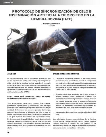 18COMERCIALPROTOCOLO DE SINCRONIZACIÓN DE CELO E INSEMINACIÓN ARTIFICIAL A TIEMPO FIJO EN LA HEMBRA BOVINA (IATF)¿QUÉ ES?La sincronización de celo es un manejo que se usa hoy en día en vacas de leche y de carne para manipular el ciclo estral de la hembra bovina, usando el ecógrafo como herramienta tecnológica, el cual permite visualizar el tracto reproductivo del animal. Además considera la aplicación de ciertas hormonas y el uso de inseminación artificial a tiempo fijo (IATF).PERO, ¿POR QUÉ USARLO?: PARA MEJORAR PARÁMETROS REPRODUCTIVOSTodo el protocolo tiene como objetivo final mejorar parámetros reproductivos y productivos. Esto se logra porque al usar este manejo logramos preñar a una mayor cantidad de hembras en un corto período de tiempo, además hace eficiente la detección de celo ya que se puede complementar con la IATF que permite inseminar a un gran número de hembras en un mismo horario. De la mano está la posibilidad de elegir descendencia genética, mejorándola según los requerimientos de cada sistema productivo. Otra ventaja es que permite obtener intervalos de partos de 12 y 13 meses obteniendo una cría al año.OTROS DATOS IMPORTANTES• La vaca es poliéstrica continua y se puede preñar cuando alcanza su madurez sexual al cumplir con los parámetros de madurez zootécnica de cada raza. Para sincronización de celo en vaquillas, es necesario asegurar que el peso de estas esté por lo menos en un 65% de su peso adulto.• El ciclo estral dura alrededor de 21 días y tiene 4 etapas: proestro, estro, metaestro y diestro. Las hormonas actúan fisiológicamente a lo largo de todas las etapas, actuando sobre la ovulación, las ondas foliculares y cuerpo lúteo del ovario, permitiendo así aplicar las hormonas adecuadas dependiendo del momento del ciclo en que se encuentre la vaca.• La gestación de la vaca tiene una duración de +/- 280 días.Los principales órganos reproductivos de la hembra bovina son la cavidad vaginal, cérvix, cuerpo uterino, cuernos uterinos y ovarios. En los ovarios (2) se desarrollan y modifican, según la etapa del ciclo estral, estructuras como cuerpo lúteo y folículos.Equipo AgroserviciosCOLUN