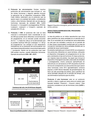 21COMERCIALFigura 3. Dispositivo intravaginal, parches detectores de celo o monta y pinturas.Día 0 Día 8BE + DIBRetirar DIBAplicar PGF2α+ E.C.PParche detector de celo (opcional)Día 10 Día 33 Día 40IATF después de 52-56 horas de retirado el DIBAplicarDIB+BERetirar DIB+diagnóstico ecográfico de preñez tempranaComienzo del celo a las 30-90 horas despuésVacas no preñadas pueden volver a re sincronizarse2. Protocolo de sincronización: Existen muchos protocolos de sincronización que incluyen el uso de ciertas hormonas y algunos además incluyen la aplicación de un dispositivo intrauterino (DIB). Cada médico veterinario usa el protocolo que se ajusta mejor a la realidad del predio, considerando costos y otros factores. Ejemplo del uso de algunas hormonas: benzoato de estradiol (BE), GnRH (Gonasyl® o Conceptal®) prostaglandinas (PGF2α: Lutalyse®, Luteosyl® o Ciclase®), cipionato de estradiol (E.C.P), etc.3. Protocolo 1 DIB: el protocolo del cual se hará mención a continuación tiene considerado el uso de DIB que puede tener diferentes concentraciones de progesterona, en el mercado puede encontrar de 0,5 – 1 y hasta de 1,38 gr, se ha demostrado que es posible reutilizar DIB que contengan 1 o 1,38 gr de progesterona. Las ventajas al usar dispositivos intrauterinos en su protocolo de sincronización son que mejora la tasa de preñez y se acorta el lapso parto – concepción. Dentro de los protocolos que usan DIB existen muchos, usando diferentes hormonas. Ejemplo de protocolo DIB + BE + ECP:RESULTADOS ESPERADOS DEL PROGRAMA: TASA DE PREÑEZLa tasa de preñez es un índice reproductivo que sirve para cuantificar las vacas preñadas en un período de 21 días. Es el resultado de la cantidad de vacas detectadas en celo que son enviadas a servicio en un período de 21 días (vacas inseminadas) multiplicado por la tasa de concepción (cantidad de vacas preñadas dividido por la cantidad de vacas inseminadas).En estudios realizados por Uchuari (2013), se compararon tres protocolos diferentes en vacas lecheras, utilizando el dispositivo intravaginal con progesterona en los tres pero cambiando el tipo de hormona. El mejor protocolo, con mejores tasas de preñez, fue aquel que incluyó el dispositivo intravaginal asociado a benzoato de estradiol y prostaglandina, mismo protocolo ejemplificado en este artículo, el cual alcanzo un 50% de preñez al primer servicio en comparación con otros protocolos que usaron otras hormonas como ECG (gonadotropina coriónica equina) y GnRH (factor liberador de gonadotropina). Se hace uso del porcentaje de preñez, para cuantificar las vacas preñadas después de un período de tiempo, una vez terminado el protocolo que se utilizó.Protocolo 2 solo hormonas: este es un protocolo sencillo y clásico, usado por varios años en nuestro país llamado también “Presynch – Ovsynch clásico”. Este protocolo considera el uso de hormonas como GnRH + PGF2. Días en donde seconcentran lamayor cantidadde celosToda la que muestre celo se inseminaFigura 4. Protocolo “Presynch – Ovsynch clásico”