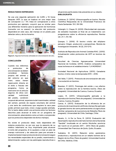 22COMERCIALCONCLUSIÓNCuando nos referimos a protocolos de sincronización se deben considerar factores propios del animal y del entorno en que viven, estos tienen repercusión directa en el éxito o fracaso del programa. Como se mencionó en el artículo algunos de ellos son: calidad nutricional del predio, condición corporal del animal, experiencia del inseminador, calidad del semen, período de espera voluntaria del animal y una serie de condiciones que requiere la vaca para poder, primero que todo, ciclar y luego quedar preñada. Por lo tanto debe existir una armonía entre los factores descritos para alcanzar el éxito en un programa de sincronización, abarcándolo como un todo y comprender que los protocolos dependen de dichos manejos.No existe el protocolo ideal, todo dependerá del sistema productivo, es por eso que la asesoría de su médico veterinario es muy importante para alcanzar el éxito del programa, él le ayudará a crear un plan de manejo nutricional y de selección para pre encaste e implementará el mejor protocolo de sincronización según las necesidades especiales de su predio, examinando y determinando cuales son las patologías reproductivas o RESULTADOS ESPERADOSSe usa una segunda aplicación de GnRh y 16 horas después IATF, lo que se traduce en una mejor tasa de concepción (+/- 5% más) en comparación a otros protocolos por ejemplo: cosynch que es similar pero usa diferentes horarios para la aplicación de hormonas (consulte con su asesor). La elección del protocolo dependerá en este caso, del manejo en el predio para detectar celos y de los horarios. Figura 5. Algunas hormonas utilizadas en sincronización de celo. situaciones particulares más presentes en su rebaño. BIBLIOGRAFÍAGutiérrez, D. (2014). Ultrasonografía en bovino. Revista Científica Respuestas de la Universidad Francisco de Paula Santander. 19:1, 99-106. Uslenghi, G. Chayer, R. (2010). Efectividad del cipionato de estradiol inyectado al final de un tratamiento con progesterona sobre la eficiencia reproductiva. Revista vet. 21: 1, 55–58. Quespe, J. (2016). El bovino criollo del altiplano peruano: Origen, producción y perspectivas. Revista de Investigación Altoandin, 18 (3), 257-270. Instituto de Reproducción Animal Cordoba IRAC. (2010). Actualización sobre protocolos de IATF en bovinos de leche. Facultad de Ciencias Agropecuarias Universidad Nacional de Cordoba. (2014). Análisis comparativo de razas lecheras en el establecimiento “LA MORENA”.Sociedad Nacional de Agricultura. (2015). Ganadería bovina: ¿Cómo viene la temporada 2015 – 2016. Del Valle, T. (2011). Protocolo de sincronización del celo y la ovulación en bovinos. Buestan, P. (2011). Fisiología del estrés y sus efectos sobre la reproducción de la hembra bovina. (Tesis de pregrado). Universidad de Cuenca, Cuenca, Ecuador. Lopez, R. (2011). Ultrasonografía aplicada a la reproducción bovina (Tesis de pregrado). Universidad de Cuenca, Cuenca, Ecuador. García, A. (2015). Evaluación de la eficiencia de un protocolo de inseminación artificial a tiempo fijo aplicado al ganado bovino de carne perteneciente a la agricultura familiar campesina de la provincia de Melipilla (Tesis de pregrado). Universidad de Chile, Santiago, Chile.Revelo, G., & De La Torre, R. (2013). Evaluación del desempeño reproductivo del hato lechero de la Hacienda “Sandial” localizada en el cantón Montufar, provincia del Carchi en el período 2011 – 2013 (Tesis de grado). Universidad San Francisco de Quito, Quito, Ecuador. Subiabre, M. (2011). Relación entre parámetros productivos y reproductivos en un rebaño lechero de la Región de los Ríos (Tesis de grado). Universidad Austral de Chile, Valdivia, Chile.