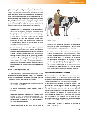 5BIENESTAR ANIMALespacio extra que asegure un adecuado ejercicio diario de los animales, para ello se sugiere que los animales tengan acceso a un área de ejercicio durante al menos 4 horas diarias (si las condiciones climáticas lo permiten). En el caso de un rebaño grande, lo ideal es contar con un protocolo diario de salidas, acompañado de registros, que entreguen la información diaria de la hora de acceso por lote y así se asegure que todos los animales tengan igual oportunidad de salir. El espacio destinado al ejercicio debería tener las siguientes características: • El área de ejercicio debería tener zonas de protección contra las condiciones climáticas extremas, como por ejemplo árboles u otras estructuras que provean sombra. Contar con bebedores y zonas cómodas y secas donde las vacas puedan echarse. Como aleternativa, el área de ejercicios puede estar conectado al patio de estabulación, dejándolas a las vacas el acceso libre para acceder al agua, cama y protección ambiental. • Se recomienda que el piso del patio de ejercicio sea de tierra o algún sustrato blando, ello permite disminuir la presión del piso sobre las pezuñas y que, además, las vacas puedan “descansar” del concreto, reduciendo así la posibilidad de patologías podales. Considerar que en períodos de lluvia el barro no debe tener una profundidad por encima de la altura de los tobillos, una posible estrategia para disminuir la presencia de barro es techar el patio de ejercicio, lo cual además les proporcionara sombra en época de calor. DISEÑOS DE LOS CUBÍCULOS: Los cubículos deben ser diseñados de acuerdo al tipo de animales presentes en cada rebaño. Sin embargo, existen cosideraciones generales para este tipo de construcción que se describen a continuación: • La densidad del grupo no debe exceder el número de cubículos disponibles. • Se deben proporcionar camas limpias, secas y cómodas. • El espacio disponible debe permitir a los animales realizar cambios posturales. Las vacas deben ser capaces de cambiar de posición, acostarse cuando están paradas y viceversa, de una manera normal, sin dificultades y sin herirse. • Todo el cuerpo de la vaca debe entrar sobre la cama cuando está echada, incluidos la zona de las corvas y ubres. • Los cubículos deben ser diseñados de manera de alinear a las vacas apropiadamente, y deben evitar interferir o herir a una vaca vecina o a sí misma. • La altura del cubículo debe ser suficiente para evitar que las heces sean empujadas sobre la cama durante la limpieza del pasillo, y para evitar que las vacas entren al revés y se acuesten con la cabeza hacia adelante. Sin embargo, el cubículo no debe ser tan alto que pueda provocar heridas en las pezuñas. Idealmente, el cubículo debería tener una altura minima de 15 cm (18-20 cm si hay limpiadores automáticos), y como máximo una altura de 20 cm para no dificultar la entrada de la vaca al cubículo.RECOMENDACIONES ADICIONALES: Se recomienda tener más cubículos que el número de animales: minimo un 5% más, idealmente un 10% más, por ejemplo: si tenemos 100 vacas estabuladas debemos contar como minimo con 110 cubiculos disponibles.No existe un tamaño estándar de cubículo, debido a que depende del tipo de rebaño y tamaño de los animales (por ejemplo: los cubículos para vacas de la raza jersey son más pequeños que para vacas de la raza Holstein friesien si consideramos el tamaño y estructura corporal de los animales con respecto al diseño utilizado). Lo importante en el diseño de los cubículos, es considerar que no quede corto o estrecho para ninguna vaca. En general se recomienda las siguientes dimensiones para maximizar la comodidad de los animales: • Ancho: 1,8m x el ancho de la cadera de las vacas, o bien 1,25-1,40 m.