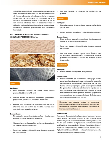 7BIENESTAR ANIMALsobre bienestar animal, se establece que existe un serio problema si más del 5% de las vacas tienen el vientre, ubres y/o miembros posteriores sucios. En el caso de colchonetas, lo óptimo es hacer la limpieza durante cada ordeña, o dos veces al día, si son ordeñas robóticas. Para los otros materiales, se deberían revisar diariamente y rellenar o reemplazar el material a medida que adquiere más suciedad o humedad.RECOMENDACIONES ADICIONALES SOBRE ALGUNAS OPCIONES DE CAMA: Arena Ventajas:• Muy cómodo cuando la cama tiene buena profundidad (mínimo 10 cm). • Reduce mucho las lesiones en caderas y miembros posteriores, y reduce la presencia de cojeras. • Retiene más humedad, se mantiene más seca y es eficiente para el control de mastitis. Se les hace más fácil a las vacas levantarse. Desventajas:• No cualquier arena sirve, debe ser fina y limpia, pues algunos tipos de arena son abrasivos.• Al depositarse en los pasillos acelera el desgaste de las paletas de los limpiadores. • Toma más trabajo rellenar/limpiar la cama y puede ser más costoso. • Hay que adaptar el sistema de recolección de purines. Aserrín Ventajas: • Cómoda cuando la cama tiene buena profundidad (10 cm min). • Menos lesiones en caderas y miembros posteriores.Desventajas:• Si no se tiene buena frecuencia de limpieza puede favorecer el desarrollo de mastitis. • Toma más trabajo rellenar/limpiar la cama y puede ser costoso. • Hay que tener cuidado con el polvo (dañino para los animales y el personal) y presencia de material punzante. Por lo tanto la calidad del material es muy importante. Colchoneta Ventajas:• Menor trabajo de limpieza, más práctico. Desventajas:• Menos cómodo, se recomienda usar paja encima para hacerlo más atractivo para echarse (la paja debe ser cambiada diariamente). Tiene que ser de muy buena calidad, esponjosa y con buena profundidad. En general se endurece relativamente rápido con el uso. Considerar que mientras más cómoda la cama, más tiempo las vacas pasarán echadas (y por ende menos cojeras) y menos posibilidad de lesiones en los miembros posteriores y ubre. Recuerde que nuestro equipo se encuentra disponible para responder sus dudas o consultas referentes al bienestar de su rebaño. Escribanos a bienestar.animal@colun.clReferenciasNormas de Bienestar Animal para Vacas lecheras, Humane Farm Animal Care Dairy housing: a best practice guide, AHDB Dairy RSPCA welfare standards for dairy cattle Guide for the Care and Use of Agricultural Animals in Research and Teaching, American Dairy Science Association (https://w w w.adsa.org/Portals/_default/SiteContent/docs/AgGuide3rd/Chapter07.pdf) https://extension.psu.edu/natural-ventilation-for-freestall-barns