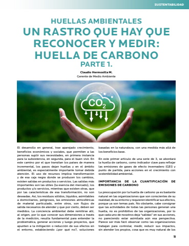 11HUELLAS AMBIENTALESUN RASTRO QUE HAY QUE RECONOCER Y MEDIR: HUELLA DE CARBONOPARTE 1.Claudio Hermosilla M.Gerente de Medio AmbienteEl desarrollo en general, trae aparejado crecimiento, beneficios econ%u00f3micos y sociales, que permiten a las personas suplir sus necesidades, en primera instancia para la subsistencia, en segunda, para el buen vivir. En este camino por el que transitan los pa%u00edses de manera incremental, los pasos dejan huellas y en el %u00e1mbito ambiental, es especialmente importante tomar debida atenci%u00f3n. El uso de recursos implica transformaci%u00f3n y de esa caja negra donde se producen los cambios, existen salidas en productos o servicios. Las salidas m%u00e1s importantes son las %u00fatiles (la esencia del mercado), los productos y/o servicios, mientras que existen otras, que por las caracter%u00edsticas de esa transformaci%u00f3n, no son deseadas. As%u00ed, los residuos s%u00f3lidos, l%u00edquidos, asimilables a domiciliarios, peligrosos, las emisiones atmosf%u00e9ricas de material particulado, entre otros, son flujos de salida necesarios de atender y que por cierto, deben ser medidos. La conciencia ambiental debe remitirse all%u00ed, al origen, por lo que conocer sus dimensiones a trav%u00e9s de la medici%u00f3n, resulta fundamental para entender la problem%u00e1tica, generar acciones y luego proyectos, que apunten a la mitigaci%u00f3n o reducci%u00f3n de sus efectos en el entorno, estableciendo %u00bfpor qu%u00e9 no?, soluciones basadas en la naturaleza, con una medida m%u00e1s all%u00e1 de los beneficios base.En este primer art%u00edculo de una serie de 3, se abordar%u00e1 la huella de carbono, como indicador clave para reflejar las emisiones de gases de efecto invernadero (GEI) y punto de partida, para acciones en el crecimiento con sostenibilidad ambiental. IMPORTANCIA DE LA CUANTIFICACI%u00d3N DE EMISIONES DE CARBONOLa preocupaci%u00f3n por la huella de carbono ya es bastante natural en las organizaciones que son conscientes de su realidad, de su entorno y requieren identificar sus efectos, porque ya son temas pa%u00eds. No obstante, cabe consignar que las actividades de todas las personas generan una huella, no es prohibitivo de las organizaciones, por lo que cada uno de nosotros deja %u201csalidas%u201d en sus acciones, no pareciendo estar asimilada a%u00fan esa perspectiva. Parece ser m%u00e1s f%u00e1cil observar como las organizaciones trabajan para controlar, medir, reducir sus impactos, sin atender los propios, cosa que es muy natural de los SUSTENTABILIDAD