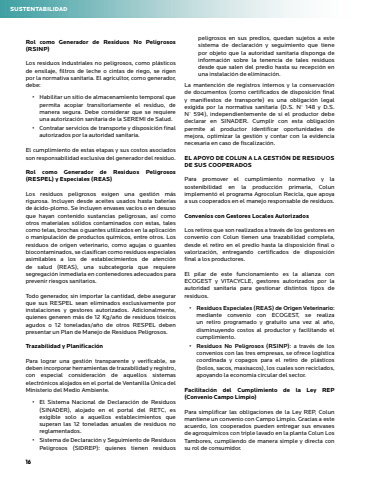 16SUSTENTABILIDADRol como Generador de Residuos No Peligrosos (RSINP)Los residuos industriales no peligrosos, como pl%u00e1sticos de ensilaje, filtros de leche o cintas de riego, se rigen por la normativa sanitaria. El agricultor, como generador, debe:%u2022 Habilitar un sitio de almacenamiento temporal que permita acopiar transitoriamente el residuo, de manera segura. Debe considerar que se requiere una autorizaci%u00f3n sanitaria de la SEREMI de Salud.%u2022 Contratar servicios de transporte y disposici%u00f3n final autorizados por la autoridad sanitaria.El cumplimiento de estas etapas y sus costos asociados son responsabilidad exclusiva del generador del residuo.Rol como Generador de Residuos Peligrosos (RESPEL) y Especiales (REAS)Los residuos peligrosos exigen una gesti%u00f3n m%u00e1s rigurosa. Incluyen desde aceites usados hasta bater%u00edas de %u00e1cido-plomo. Se incluyen envases vac%u00edos o en desuso que hayan contenido sustancias peligrosas, as%u00ed como otros materiales s%u00f3lidos contaminados con estas, tales como telas, brochas o guantes utilizados en la aplicaci%u00f3n o manipulaci%u00f3n de productos qu%u00edmicos, entre otros. Los residuos de origen veterinario, como agujas o guantes biocontaminados, se clasifican como residuos especiales asimilables a los de establecimientos de atenci%u00f3n de salud (REAS), una subcategor%u00eda que requiere segregaci%u00f3n inmediata en contenedores adecuados para prevenir riesgos sanitarios.Todo generador, sin importar la cantidad, debe asegurar que sus RESPEL sean eliminados exclusivamente por instalaciones y gestores autorizados. Adicionalmente, quienes generen m%u00e1s de 12 Kg/a%u00f1o de residuos t%u00f3xicos agudos o 12 toneladas/a%u00f1o de otros RESPEL deben presentar un Plan de Manejo de Residuos Peligrosos.Trazabilidad y Planificaci%u00f3nPara lograr una gesti%u00f3n transparente y verificable, se deben incorporar herramientas de trazabilidad y registro, con especial consideraci%u00f3n de aquellos sistemas electr%u00f3nicos alojados en el portal de Ventanilla %u00danica del Ministerio del Medio Ambiente.%u2022 El Sistema Nacional de Declaraci%u00f3n de Residuos (SINADER), alojado en el portal del RETC, es exigible solo a aquellos establecimientos que superan las 12 toneladas anuales de residuos no reglamentados.%u2022 Sistema de Declaraci%u00f3n y Seguimiento de Residuos Peligrosos (SIDREP): quienes tienen residuos peligrosos en sus predios, quedan sujetos a este sistema de declaraci%u00f3n y seguimiento que tiene por objeto que la autoridad sanitaria disponga de informaci%u00f3n sobre la tenencia de tales residuos desde que salen del predio hasta su recepci%u00f3n en una instalaci%u00f3n de eliminaci%u00f3n.La mantenci%u00f3n de registros internos y la conservaci%u00f3n de documentos (como certificados de disposici%u00f3n final y manifiestos de transporte) es una obligaci%u00f3n legal exigida por la normativa sanitaria (D.S. N%u00b0 148 y D.S. N%u00b0 594), independientemente de si el productor debe declarar en SINADER. Cumplir con esta obligaci%u00f3n permite al productor identificar oportunidades de mejora, optimizar la gesti%u00f3n y contar con la evidencia necesaria en caso de fiscalizaci%u00f3n.EL APOYO DE COLUN A LA GESTI%u00d3N DE RESIDUOS DE SUS COOPERADOSPara promover el cumplimiento normativo y la sostenibilidad en la producci%u00f3n primaria, Colun implement%u00f3 el programa Agrocolun Recicla, que apoya a sus cooperados en el manejo responsable de residuos.Convenios con Gestores Locales AutorizadosLos retiros que son realizados a trav%u00e9s de los gestores en convenio con Colun tienen una trazabilidad completa, desde el retiro en el predio hasta la disposici%u00f3n final o valorizaci%u00f3n, entregando certificados de disposici%u00f3n final a los productores.El pilar de este funcionamiento es la alianza con ECOGEST y VITACYCLE, gestores autorizados por la autoridad sanitaria para gestionar distintos tipos de residuos.%u2022 Residuos Especiales (REAS) de Origen Veterinario:mediante convenio con ECOGEST, se realiza un retiro programado y gratuito una vez al a%u00f1o, disminuyendo costos al productor y facilitando el cumplimiento.%u2022 Residuos No Peligrosos (RSINP): a trav%u00e9s de los convenios con las tres empresas, se ofrece log%u00edstica coordinada y copagos para el retiro de pl%u00e1sticos (bolos, sacos, maxisacos), los cuales son reciclados, apoyando la econom%u00eda circular del sector.Facilitaci%u00f3n del Cumplimiento de la Ley REP (Convenio Campo Limpio)Para simplificar las obligaciones de la Ley REP, Colun mantiene un convenio con Campo Limpio. Gracias a este acuerdo, los cooperados pueden entregar sus envases de agroqu%u00edmicos con triple lavado en la planta Colun Los Tambores, cumpliendo de manera simple y directa con su rol de consumidor.