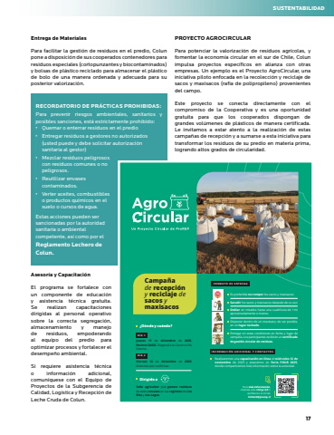 17SUSTENTABILIDADEntrega de MaterialesPara facilitar la gesti%u00f3n de residuos en el predio, Colun pone a disposici%u00f3n de sus cooperados contenedores para residuos especiales (cortopunzantes y biocontaminados) y bolsas de pl%u00e1stico reciclado para almacenar el pl%u00e1stico de bolo de una manera ordenada y adecuada para su posterior valorizaci%u00f3n.Asesor%u00eda y Capacitaci%u00f3nEl programa se fortalece con un componente de educaci%u00f3n y asistencia t%u00e9cnica gratuita. Se realizan capacitaciones dirigidas al personal operativo sobre la correcta segregaci%u00f3n, almacenamiento y manejo de residuos, empoderando al equipo del predio para optimizar procesos y fortalecer el desempe%u00f1o ambiental.Si requiere asistencia t%u00e9cnica o informaci%u00f3n adicional, comun%u00edquese con el Equipo de Proyectos de la Subgerencia de Calidad, Log%u00edstica y Recepci%u00f3n de Leche Cruda de Colun.RECORDATORIO DE PR%u00c1CTICAS PROHIBIDAS:Para prevenir riesgos ambientales, sanitarios y posibles sanciones, est%u00e1 estrictamente prohibido:%u2022 Quemar o enterrar residuos en el predio%u2022 Entregar residuos a gestores no autorizados (usted puede y debe solicitar autorizaci%u00f3n sanitaria al gestor)%u2022 Mezclar residuos peligrosos con residuos comunes o no peligrosos.%u2022 Reutilizar envases contaminados.%u2022 Verter aceites, combustibles o productos qu%u00edmicos en el suelo o cursos de agua.Estas acciones pueden ser sancionadas por la autoridad sanitaria o ambiental competente, as%u00ed como por el Reglamento Lechero de Colun.PROYECTO AGROCIRCULARPara potenciar la valorizaci%u00f3n de residuos agr%u00edcolas, y fomentar la econom%u00eda circular en el sur de Chile, Colun impulsa proyectos espec%u00edficos en alianza con otras empresas. Un ejemplo es el Proyecto AgroCircular, una iniciativa piloto enfocada en la recolecci%u00f3n y reciclaje de sacos y maxisacos (rafia de polipropileno) provenientes del campo.Este proyecto se conecta directamente con el compromiso de la Cooperativa y es una oportunidad gratuita para que los cooperados dispongan de grandes vol%u00famenes de pl%u00e1sticos de manera certificada.Le invitamos a estar atento a la realizaci%u00f3n de estas campa%u00f1as de recepci%u00f3n y a sumarse a esta iniciativa para transformar los residuos de su predio en materia prima, logrando altos grados de circularidad.Campa%u00f1a de recepci%u00f3n y reciclaje desacos ymaxisacos%u00bfD%u00f3nde y cu%u00e1ndo?Dirigido aTodo agricultor que genere residuos de estos envases en las regiones de Los R%u00edos y Los Lagos.INFORMACI%u00d3N ADICIONAL Y CONTACTOSEs preferible no romper los sacos y maxisacosSacudir los sacos y maxisacos despu%u00e9s de su uso Doblar en mitades hasta una cuadr%u00edcula de 1mt aproximadamente o menos.Disponer dentro de un maxisaco, de ser posible, en un lugar techado.Entregar en estas condiciones en fecha y lugar de campa%u00f1a. Los participantes recibir%u00e1n un certificado de gesti%u00f3n circular de residuos.Realizaremos una capacitaci%u00f3n en l%u00ednea el mi%u00e9rcoles 12 de noviembre de 2025 y estaremos en Feria FISUR 2025, donde compartiremos m%u00e1s informaci%u00f3n sobre la actividad.FORMATO DE ENTREGA Jueves 11 de diciembre de 2025, Recinto SAGO, Diagonal Los Carrera S/N, Osorno.Viernes 12 de diciembre de 2025, Direcci%u00f3n por confirmar. D%u00cdA 1D%u00cdA 2ORGANIZA AUSPICIAPara m%u00e1s informaci%u00f3n, escanea este c%u00f3digo QR o escr%u00edbenos al correo lrichard@prorep.cl