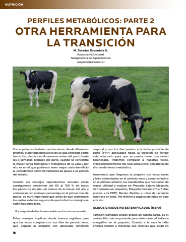 18NUTRICI%u00d3NPERFILES METAB%u00d3LICOS: PARTE 2OTRA HERRAMIENTA PARA LA TRANSICI%u00d3NM. Soledad Esp%u00edndola G.Asesor%u00eda Nutricional Subgerencia de Agroserviciossespindola@colun.clComo ya hemos tratado muchas veces, desde diferentes prismas, el per%u00edodo productivo de la vaca conocido como transici%u00f3n, desde casi 4 semanas antes del parto hasta las 3 semanas despu%u00e9s del parto, cuando se concentra la mayor carga fisiol%u00f3gica y metab%u00f3lica de la vaca y por ello es en el que podemos tener mejor costo-beneficio al considerarlo como herramienta de apoyo a la gesti%u00f3n del reba%u00f1o. Cuando los manejos reproductivos actuales est%u00e1n consiguiendo concentrar del 60 al 100 % de todos los partos de un a%u00f1o, en menos de 4 meses del a%u00f1o y comienzan con el mayor porcentaje en el primer mes de partos, es muy importante que antes de que comiencen los partos estemos seguros de que todos los manejos se est%u00e9n haciendo bien. %u00a1La mayor%u00eda de los huevos est%u00e1n en la misma canasta!Estos manejos implican desde buenos registros para que las vacas cumplan con sus d%u00edas de periodo seco, que lleguen al preparto con adecuada condici%u00f3n corporal y con los d%u00edas previos a la fecha probable de parto (FPP) adecuados hasta la elecci%u00f3n de forraje m%u00e1s adecuado para que se pueda hacer una raci%u00f3n balanceada. Podemos comparar a nuestras vacas, independientemente del nivel productivo, con atletas de alto rendimiento metab%u00f3lico. Asumiendo que llegamos al preparto con vacas sanas y bien alimentadas en el periodo seco y como se indic%u00f3 en el art%u00edculo anterior, los metabolitos que nos ser%u00edan de mayor utilidad a evaluar en Preparto Lejano (despu%u00e9s de 1 semana en preparto), Preparto Cercano (10 a 5 d%u00edas previos a la FPP), Reci%u00e9n Paridas e Inicio de lactancia son trece en total. Me referir%u00e9 a algunos de ellos en este art%u00edculo.%u00c1CIDOS GRASOS NO ESTERIFICADOS (NEFA)Tambi%u00e9n llamados %u00e1cidos grasos de cadena larga. Es el metabolito m%u00e1s importante para determinar el balance energ%u00e9tico en el preparto. Cuando a la vaca le falta energ%u00eda recurre a movilizar sus reservas que est%u00e1n en