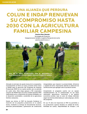 24CALIDAD DE LECHEUNA ALIANZA QUE PERDURACOLUN E INDAP RENUEVAN SU COMPROMISO HASTA 2030 CON LA AGRICULTURA FAMILIAR CAMPESINAPaulina P%u00e1ez StuardoEncargada de Proyectos Subgerencia de Calidad y Log%u00edstica Recepci%u00f3n de Lechepaulina.paez@colun.clAlineado al principio de ayuda mutua de la cooperativa, recientemente se firm%u00f3 un nuevo convenio entre Colun e INDAP para la ejecuci%u00f3n del Programa de Alianzas Productivas (PAP) en su cuarta versi%u00f3n, por un periodo de cuatro a%u00f1os. Esta etapa agrupa a 146 cooperados usuarios de INDAP bajo una %u00fanica unidad operativa PAP, reafirmando as%u00ed el compromiso de ambas entidades con el desarrollo sustentable y sostenible de la agricultura familiar campesina.Desde sus inicios, el PAP ha buscado fortalecer la inserci%u00f3n de los peque%u00f1os productores en la cadena l%u00e1ctea, mediante la entrega de herramientas t%u00e9cnicas, asesor%u00edas personalizadas y generaci%u00f3n de condiciones intraprediales que mejoren la productividad, eficiencia y calidad de leche, impulsando adem%u00e1s la obtenci%u00f3n de certificaciones que agregan valor al producto l%u00e1cteo. Actualmente el programa cuenta con un equipo multidisciplinario de 15 profesionales en las %u00e1reas veterinaria, agron%u00f3mica, nutricional y de gesti%u00f3n econ%u00f3mica predial, bajo un plan de trabajo dise%u00f1ado seg%u00fan las brechas detectadas por cada subgrupo, dentro del programa. En sus 15 a%u00f1os de trayectoria el PAP, ha permitido a los productores superar desaf%u00edos en calidad de leche, fertilidad de suelos, disponibilidad de forrajes y de M%u00c1S DE 15 A%u00d1OS TRABAJANDO POR EL DESARROLLO SOSTENIBLE DE LOS PEQUE%u00d1OS PRODUCTORES LECHEROS