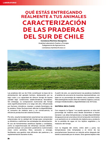26LABORATORIOQU%u00c9 EST%u00c1S ENTREGANDO REALMENTE A TUS ANIMALES CARACTERIZACI%u00d3N DE LAS PRADERAS DEL SUR DE CHILEConstanza Mart%u00ednez DavagninoAnalista Laboratorio Suelos y ForrajesSubgerencia de Agroservicosconstanza.martinez@colun.clLas praderas del sur de Chile constituyen la base de la alimentaci%u00f3n del ganado lechero, destacando por su bajo costo y su capacidad de ofrecer forraje de buena calidad bajo condiciones edafoclim%u00e1ticas favorables. Sin embargo, la composici%u00f3n nutricional del forraje var%u00eda significativamente a lo largo del a%u00f1o, influenciada por factores clim%u00e1ticos, manejo y estado fenol%u00f3gico de la pradera. Estas fluctuaciones afectan la digestibilidad, el consumo de materia seca y, en consecuencia, la eficiencia productiva del sistema lechero.Por ello, resulta fundamental caracterizar las variaciones estacionales de la calidad del forraje para comprender su din%u00e1mica y optimizar las estrategias de alimentaci%u00f3n. El uso de herramientas anal%u00edticas r%u00e1pidas y confiables, como la espectroscopia de infrarrojo cercano (NIRS), permite evaluar con precisi%u00f3n par%u00e1metros nutricionales clave como prote%u00edna, fibra, az%u00facares y energ%u00eda, facilitando una gesti%u00f3n m%u00e1s eficiente del pastoreo y la suplementaci%u00f3n durante el a%u00f1o.A partir de esto, se caracterizaron las praderas mediante el an%u00e1lisis de una serie de muestras representativas, con base en su porcentaje de materia seca, prote%u00edna cruda, fibra detergente neutro libre de materia org%u00e1nica, az%u00facar, energ%u00eda metabolizable y digestibilidad a las 30 horas.MATERIA SECA (%MS)Con respecto la figura 1 se puede apreciar un alza del porcentaje de materia seca desde diciembre a marzo (verano). Las altas temperaturas y la baja disponibilidad de agua provocan una reducci%u00f3n en la tasa de crecimiento y un aumento en el contenido de materia seca, producto de la p%u00e9rdida de agua en los tejidos vegetales y la madurez del forraje.Con la llegada del oto%u00f1o, entre abril y junio, las temperaturas m%u00e1s templadas y el inicio de las precipitaciones favorecen un rebrote activo despu%u00e9s del estr%u00e9s ocasionado por el verano. Esto genera tejidos m%u00e1s