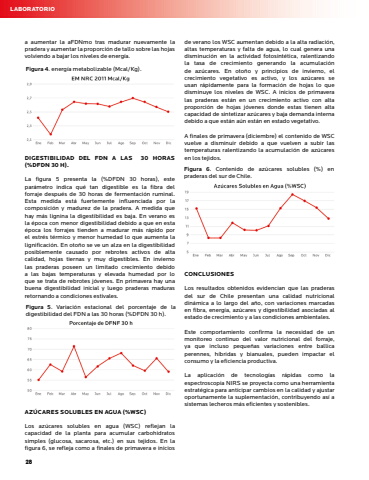 28LABORATORIOa aumentar la aFDNmo tras madurar nuevamente la pradera y aumentar la proporci%u00f3n de tallo sobre las hojas volviendo a bajar los niveles de energ%u00eda.DIGESTIBILIDAD DEL FDN A LAS 30 HORAS (%DFDN 30 H).La figura 5 presenta la (%DFDN 30 horas), este par%u00e1metro indica qu%u00e9 tan digestible es la fibra del forraje despu%u00e9s de 30 horas de fermentaci%u00f3n ruminal. Esta medida est%u00e1 fuertemente influenciada por la composici%u00f3n y madurez de la pradera. A medida que hay m%u00e1s lignina la digestibilidad es baja. En verano es la %u00e9poca con menor digestibilidad debido a que en esta %u00e9poca los forrajes tienden a madurar m%u00e1s r%u00e1pido por el estr%u00e9s t%u00e9rmico y menor humedad lo que aumenta la lignificaci%u00f3n. En oto%u00f1o se ve un alza en la digestibilidad posiblemente causado por rebrotes activos de alta calidad, hojas tiernas y muy digestibles. En invierno las praderas poseen un limitado crecimiento debido a las bajas temperaturas y elevada humedad por lo que se trata de rebrotes j%u00f3venes. En primavera hay una buena digestibilidad inicial y luego praderas maduras retornando a condiciones estivales.AZ%u00daCARES SOLUBLES EN AGUA (%WSC)Los az%u00facares solubles en agua (WSC) reflejan la capacidad de la planta para acumular carbohidratos simples (glucosa, sacarosa, etc.) en sus tejidos. En la figura 6, se refleja como a finales de primavera e inicios de verano los WSC aumentan debido a la alta radiaci%u00f3n, altas temperaturas y falta de agua, lo cual genera una disminuci%u00f3n en la actividad fotosint%u00e9tica, ralentizando la tasa de crecimiento generando la acumulaci%u00f3n de az%u00facares. En oto%u00f1o y principios de invierno, el crecimiento vegetativo es activo, y los az%u00facares se usan r%u00e1pidamente para la formaci%u00f3n de hojas lo que disminuye los niveles de WSC. A inicios de primavera las praderas est%u00e1n en un crecimiento activo con alta proporci%u00f3n de hojas j%u00f3venes donde estas tienen alta capacidad de sintetizar az%u00facares y baja demanda interna debido a que est%u00e1n a%u00fan est%u00e1n en estado vegetativo.A finales de primavera (diciembre) el contenido de WSC vuelve a disminuir debido a que vuelven a subir las temperaturas ralentizando la acumulaci%u00f3n de az%u00facares en los tejidos.CONCLUSIONESLos resultados obtenidos evidencian que las praderas del sur de Chile presentan una calidad nutricional din%u00e1mica a lo largo del a%u00f1o, con variaciones marcadas en fibra, energ%u00eda, az%u00facares y digestibilidad asociadas al estado de crecimiento y a las condiciones ambientales.Este comportamiento confirma la necesidad de un monitoreo continuo del valor nutricional del forraje, ya que incluso peque%u00f1as variaciones entre ballica perennes, h%u00edbridas y bianuales, pueden impactar el consumo y la eficiencia productiva.La aplicaci%u00f3n de tecnolog%u00edas r%u00e1pidas como la espectroscopia NIRS se proyecta como una herramienta estrat%u00e9gica para anticipar cambios en la calidad y ajustar oportunamente la suplementaci%u00f3n, contribuyendo as%u00ed a sistemas lecheros m%u00e1s eficientes y sostenibles.Figura 4. energ%u00eda metabolizable (Mcal/Kg).Figura 5. Variaci%u00f3n estacional del porcentaje de la digestibilidad del FDN a las 30 horas (%DFDN 30 h).Figura 6. Contenido de az%u00facares solubles (%) en praderas del sur de Chile.