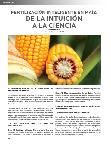 30COMERCIALFERTILIZACI%u00d3N INTELIGENTE EN MA%u00cdZ: DE LA INTUICI%u00d3N A LA CIENCIATom%u00e1s Pinedo Gerente Comercial KWSEL PROBLEMA QUE EST%u00c1 COSTANDO MILES DE PESOS POR HECT%u00c1REA%u00bfTe imaginas construir una casa sin conocer el terreno donde la vas a edificar? Suena absurdo, %u00bfverdad? Sin embargo, esto es exactamente lo que ocurre en muchos cultivos de ma%u00edz en Chile cuando se fertiliza sin an%u00e1lisis de suelo.La mayor parte del ma%u00edz en Chile se fertiliza con una alta cantidad de nitr%u00f3geno, agreg%u00e1ndose, adem%u00e1s, generalmente, f%u00f3sforo y potasio. Sin embargo, es com%u00fan que en muchos casos no se logre una nutrici%u00f3n adecuada en los cultivos, debido a dos razones cr%u00edticas que est%u00e1n afectando la rentabilidad de miles de productores.LOS DOS ERRORES M%u00c1S COSTOSOS EN FERTILIZACI%u00d3NError #1: Fertilizar a Ciegas. Por una parte, hay una cantidad de productores que no realiza an%u00e1lisis de suelo fertilizando sin tener la informaci%u00f3n necesaria y considera recomendaciones que no tienen ninguna base.Error #2: Mala Interpretaci%u00f3n de los Datos. Por otra parte, en muchas ocasiones, aunque se realicen an%u00e1lisis de suelo, estos no son interpretados por profesionales que tengan los conocimientos necesarios para hacer las recomendaciones que correspondan.LA HERRAMIENTA M%u00c1S VALIOSA: EL AN%u00c1LISIS DE SUELO COMPLETO%u00bfQu%u00e9 Debe Incluir un An%u00e1lisis Completo?Los an%u00e1lisis de suelo deben realizarse todos los a%u00f1os, considerando los siguientes par%u00e1metros: pH, materia org%u00e1nica, conductividad el%u00e9ctrica, nitr%u00f3geno, f%u00f3sforo, potasio, suma de bases, capacidad de intercambio cati%u00f3nica efectiva (incluye los valores de calcio, magnesio, potasio, sodio y aluminio) y los microelementos boro, fierro, manganeso y zinc. S%u00f3lo a partir de un an%u00e1lisis de suelo y una interpretaci%u00f3n adecuada de %u00e9ste, podr%u00e1 definirse una correcta fertilizaci%u00f3n.