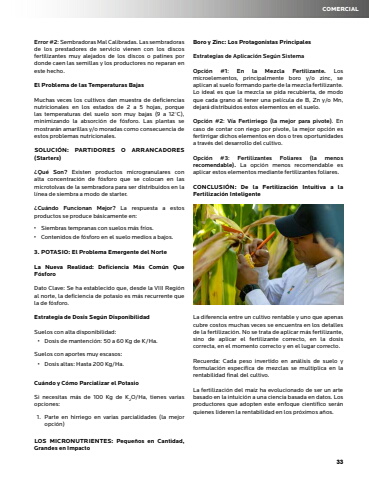 33COMERCIALError #2: Sembradoras Mal Calibradas. Las sembradoras de los prestadores de servicio vienen con los discos fertilizantes muy alejados de los discos o patines por donde caen las semillas y los productores no reparan en este hecho.El Problema de las Temperaturas BajasMuchas veces los cultivos dan muestra de deficiencias nutricionales en los estados de 2 a 5 hojas, porque las temperaturas del suelo son muy bajas (9 a 12%u00b0C), minimizando la absorci%u00f3n de f%u00f3sforo. Las plantas se mostrar%u00e1n amarillas y/o moradas como consecuencia de estos problemas nutricionales.SOLUCI%u00d3N: PARTIDORES O ARRANCADORES (Starters)%u00bfQu%u00e9 Son? Existen productos microgranulares con alta concentraci%u00f3n de f%u00f3sforo que se colocan en las microtolvas de la sembradora para ser distribuidos en la l%u00ednea de siembra a modo de starter.%u00bfCu%u00e1ndo Funcionan Mejor? La respuesta a estos productos se produce b%u00e1sicamente en:%u2022 Siembras tempranas con suelos m%u00e1s fr%u00edos.%u2022 Contenidos de f%u00f3sforo en el suelo medios a bajos.3. POTASIO: El Problema Emergente del NorteLa Nueva Realidad: Deficiencia M%u00e1s Com%u00fan Que F%u00f3sforoDato Clave: Se ha establecido que, desde la VIII Regi%u00f3n al norte, la deficiencia de potasio es m%u00e1s recurrente que la de f%u00f3sforo.Estrategia de Dosis Seg%u00fan DisponibilidadSuelos con alta disponibilidad:%u2022 Dosis de mantenci%u00f3n: 50 a 60 Kg de K/Ha.Suelos con aportes muy escasos:%u2022 Dosis altas: Hasta 200 Kg/Ha.Cu%u00e1ndo y C%u00f3mo Parcializar el PotasioSi necesitas m%u00e1s de 100 Kg de K2O/Ha, tienes varias opciones:1. Parte en hirriego en varias parcialidades (la mejor opci%u00f3n)LOS MICRONUTRIENTES: Peque%u00f1os en Cantidad, Grandes en ImpactoBoro y Zinc: Los Protagonistas PrincipalesEstrategias de Aplicaci%u00f3n Seg%u00fan SistemaOpci%u00f3n #1: En la Mezcla Fertilizante. Los microelementos, principalmente boro y/o zinc, se aplican al suelo formando parte de la mezcla fertilizante. Lo ideal es que la mezcla se pida recubierta, de modo que cada grano al tener una pel%u00edcula de B, Zn y/o Mn, dejar%u00e1 distribuidos estos elementos en el suelo.Opci%u00f3n #2: V%u00eda Fertirriego (la mejor para pivote). En caso de contar con riego por pivote, la mejor opci%u00f3n es fertirrigar dichos elementos en dos o tres oportunidades a trav%u00e9s del desarrollo del cultivo.Opci%u00f3n #3: Fertilizantes Foliares (la menos recomendable). La opci%u00f3n menos recomendable es aplicar estos elementos mediante fertilizantes foliares.CONCLUSI%u00d3N: De la Fertilizaci%u00f3n Intuitiva a la Fertilizaci%u00f3n InteligenteLa diferencia entre un cultivo rentable y uno que apenas cubre costos muchas veces se encuentra en los detalles de la fertilizaci%u00f3n. No se trata de aplicar m%u00e1s fertilizante, sino de aplicar el fertilizante correcto, en la dosis correcta, en el momento correcto y en el lugar correcto.Recuerda: Cada peso invertido en an%u00e1lisis de suelo y formulaci%u00f3n espec%u00edfica de mezclas se multiplica en la rentabilidad final del cultivo.La fertilizaci%u00f3n del ma%u00edz ha evolucionado de ser un arte basado en la intuici%u00f3n a una ciencia basada en datos. Los productores que adopten este enfoque cient%u00edfico ser%u00e1n quienes lideren la rentabilidad en los pr%u00f3ximos a%u00f1os.