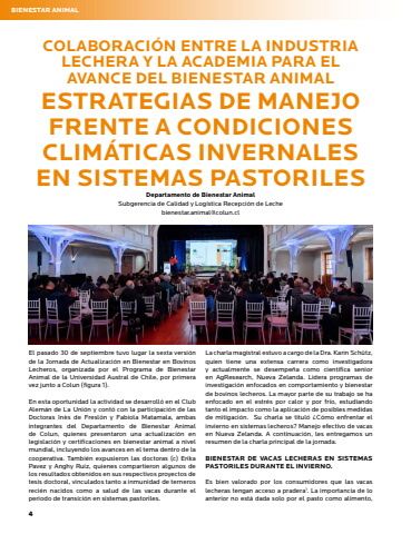 4BIENESTAR ANIMALCOLABORACI%u00d3N ENTRE LA INDUSTRIA LECHERA Y LA ACADEMIA PARA EL AVANCE DEL BIENESTAR ANIMALESTRATEGIAS DE MANEJO FRENTE A CONDICIONES CLIM%u00c1TICAS INVERNALES EN SISTEMAS PASTORILES Departamento de Bienestar AnimalSubgerencia de Calidad y Log%u00edstica Recepci%u00f3n de Lechebienestar.animal@colun.clEl pasado 30 de septiembre tuvo lugar la sexta versi%u00f3n de la Jornada de Actualizaci%u00f3n en Bienestar en Bovinos Lecheros, organizada por el Programa de Bienestar Animal de la Universidad Austral de Chile, por primera vez junto a Colun (figura 1). En esta oportunidad la actividad se desarroll%u00f3 en el Club Alem%u00e1n de La Uni%u00f3n y cont%u00f3 con la participaci%u00f3n de las Doctoras In%u00e8s de Fresl%u00f3n y Fabiola Matamala, ambas integrantes del Departamento de Bienestar Animal de Colun, quienes presentaron una actualizaci%u00f3n en legislaci%u00f3n y certificaciones en bienestar animal a nivel mundial, incluyendo los avances en el tema dentro de la cooperativa. Tambi%u00e9n expusieron las doctoras (c) Erika Pavez y Anghy Ru%u00edz, quienes compartieron algunos de los resultados obtenidos en sus respectivos proyectos de tesis doctoral, vinculados tanto a inmunidad de terneros reci%u00e9n nacidos como a salud de las vacas durante el periodo de transici%u00f3n en sistemas pastoriles. La charla magistral estuvo a cargo de la Dra. Karin Sch%u00fctz, quien tiene una extensa carrera como investigadora y actualmente se desempe%u00f1a como cient%u00edfica senior en AgResearch, Nueva Zelanda. Lidera programas de investigaci%u00f3n enfocados en comportamiento y bienestar de bovinos lecheros. La mayor parte de su trabajo se ha enfocado en el estr%u00e9s por calor y por fr%u00edo, estudiando tanto el impacto como la aplicaci%u00f3n de posibles medidas de mitigaci%u00f3n. Su charla se titul%u00f3 %u00bfC%u00f3mo enfrentar el invierno en sistemas lecheros? Manejo efectivo de vacas en Nueva Zelanda. A continuaci%u00f3n, les entregamos un resumen de la charla principal de la jornada. BIENESTAR DE VACAS LECHERAS EN SISTEMAS PASTORILES DURANTE EL INVIERNO. Es bien valorado por los consumidores que las vacas lecheras tengan acceso a pradera1. La importancia de lo anterior no est%u00e1 dada solo por el pasto como alimento,