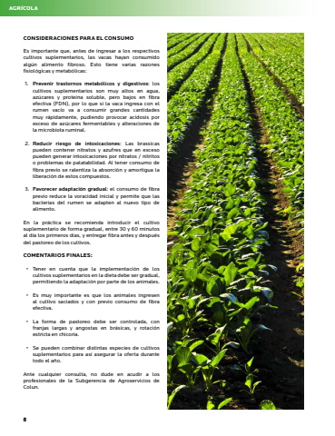 8AGR%u00cdCOLACONSIDERACIONES PARA EL CONSUMOEs importante que, antes de ingresar a los respectivos cultivos suplementarios, las vacas hayan consumido alg%u00fan alimento fibroso. Esto tiene varias razones fisiol%u00f3gicas y metab%u00f3licas: 1. Prevenir trastornos metab%u00f3licos y digestivos: los cultivos suplementarios son muy altos en agua, az%u00facares y prote%u00edna soluble, pero bajos en fibra efectiva (FDN), por lo que si la vaca ingresa con el rumen vac%u00edo va a consumir grandes cantidades muy r%u00e1pidamente, pudiendo provocar acidosis por exceso de az%u00facares fermentables y alteraciones de la microbiota ruminal. 2. Reducir riesgo de intoxicaciones: Las brassicas pueden contener nitratos y azufres que en exceso pueden generar intoxicaciones por nitratos / nitritos o problemas de palatabilidad. Al tener consumo de fibra previo se ralentiza la absorci%u00f3n y amortigua la liberaci%u00f3n de estos compuestos. 3. Favorecer adaptaci%u00f3n gradual: el consumo de fibra previo reduce la voracidad inicial y permite que las bacterias del rumen se adapten al nuevo tipo de alimento. En la pr%u00e1ctica se recomienda introducir el cultivo suplementario de forma gradual, entre 30 y 60 minutos al d%u00eda los primeros d%u00edas, y entregar fibra antes y despu%u00e9s del pastoreo de los cultivos. COMENTARIOS FINALES: %u2022 Tener en cuenta que la implementaci%u00f3n de los cultivos suplementarios en la dieta debe ser gradual, permitiendo la adaptaci%u00f3n por parte de los animales. %u2022 Es muy importante es que los animales ingresen al cultivo saciados y con previo consumo de fibra efectiva. %u2022 La forma de pastoreo debe ser controlada, con franjas largas y angostas en br%u00e1sicas, y rotaci%u00f3n estricta en chicoria.%u2022 Se pueden combinar distintas especies de cultivos suplementarios para as%u00ed asegurar la oferta durante todo el a%u00f1o. Ante cualquier consulta, no dude en acudir a los profesionales de la Subgerencia de Agroservicios de Colun.