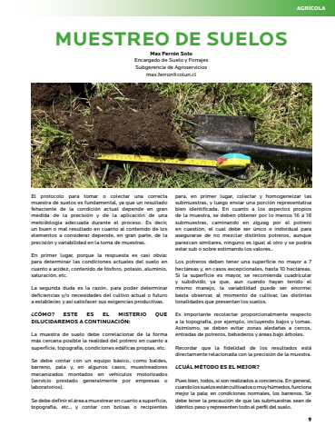 9AGR%u00cdCOLAMUESTREO DE SUELOSMax Ferr%u00f3n SotoEncargado de Suelo y ForrajesSubgerencia de Agroserviciosmax.ferron@colun.clEl protocolo para tomar o colectar una correcta muestra de suelos es fundamental, ya que un resultado fehaciente de la condici%u00f3n actual depende en gran medida de la precisi%u00f3n y de la aplicaci%u00f3n de una metodolog%u00eda adecuada durante el proceso. Es decir, un buen o mal resultado en cuanto al contenido de los elementos a considerar depende, en gran parte, de la precisi%u00f3n y variabilidad en la toma de muestras.En primer lugar, porque la respuesta es casi obvia: para determinar las condiciones actuales del suelo en cuanto a acidez, contenido de f%u00f3sforo, potasio, aluminio, saturaci%u00f3n, etc.La segunda duda es la raz%u00f3n, para poder determinar deficiencias y/o necesidades del cultivo actual o futuro a establecer, y as%u00ed satisfacer sus exigencias productivas.%u00bfC%u00d3MO? ESTE ES EL MISTERIO QUE DILUCIDAREMOS A CONTINUACI%u00d3N:La muestra de suelo debe correlacionar de la forma m%u00e1s cercana posible la realidad del potrero en cuanto a superficie, topograf%u00eda, condiciones ed%u00e1ficas propias, etc.Se debe contar con un equipo b%u00e1sico, como baldes, barreno, pala y, en algunos casos, muestreadores mecanizados montados en veh%u00edculos motorizados (servicio prestado generalmente por empresas o laboratorios).Se debe definir el %u00e1rea a muestrear en cuanto a superficie, topograf%u00eda, etc., y contar con bolsas o recipientes para, en primer lugar, colectar y homogeneizar las submuestras, y luego enviar una porci%u00f3n representativa bien identificada. En cuanto a los aspectos propios de la muestra, se deben obtener por lo menos 16 a 18 submuestras, caminando en zigzag por el potrero en cuesti%u00f3n, el cual debe ser %u00fanico e individual para asegurarse de no mezclar distintos potreros, aunque parezcan similares, ninguno es igual al otro y se podr%u00eda estar sub o sobre estimando los valores..Los potreros deben tener una superficie no mayor a 7 hect%u00e1reas y, en casos excepcionales, hasta 10 hect%u00e1reas. Si la superficie es mayor, se recomienda cuadricular y subdividir, ya que, aun cuando hayan tenido el mismo manejo, la variabilidad puede ser enorme; basta observar, al momento de cultivar, las distintas tonalidades que presentan los suelos.Es importante recolectar proporcionalmente respecto a la topograf%u00eda, por ejemplo, incluyendo bajos y lomas. Asimismo, se deben evitar zonas aleda%u00f1as a cercos, entradas de potreros, bebederos y %u00e1reas bajo %u00e1rboles.Recordar que la fidelidad de los resultados est%u00e1 directamente relacionada con la precisi%u00f3n de la muestra.%u00bfCU%u00c1L M%u00c9TODO ES EL MEJOR?Pues bien, todos, si son realizados a conciencia. En general, cuando los suelos est%u00e1n cultivados o muy h%u00famedos, funciona mejor la pala; en condiciones normales, los barrenos. Se debe tener la precauci%u00f3n de que las submuestras sean de id%u00e9ntico peso y representen todo el perfil del suelo.